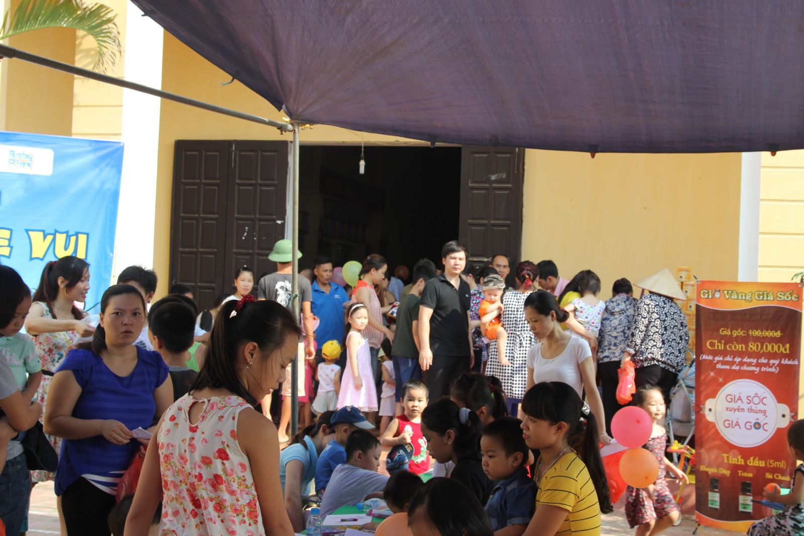 Khu vực trưng bày hàng và phát quà miễn phí cho các bậc phụ huynh tham dự.