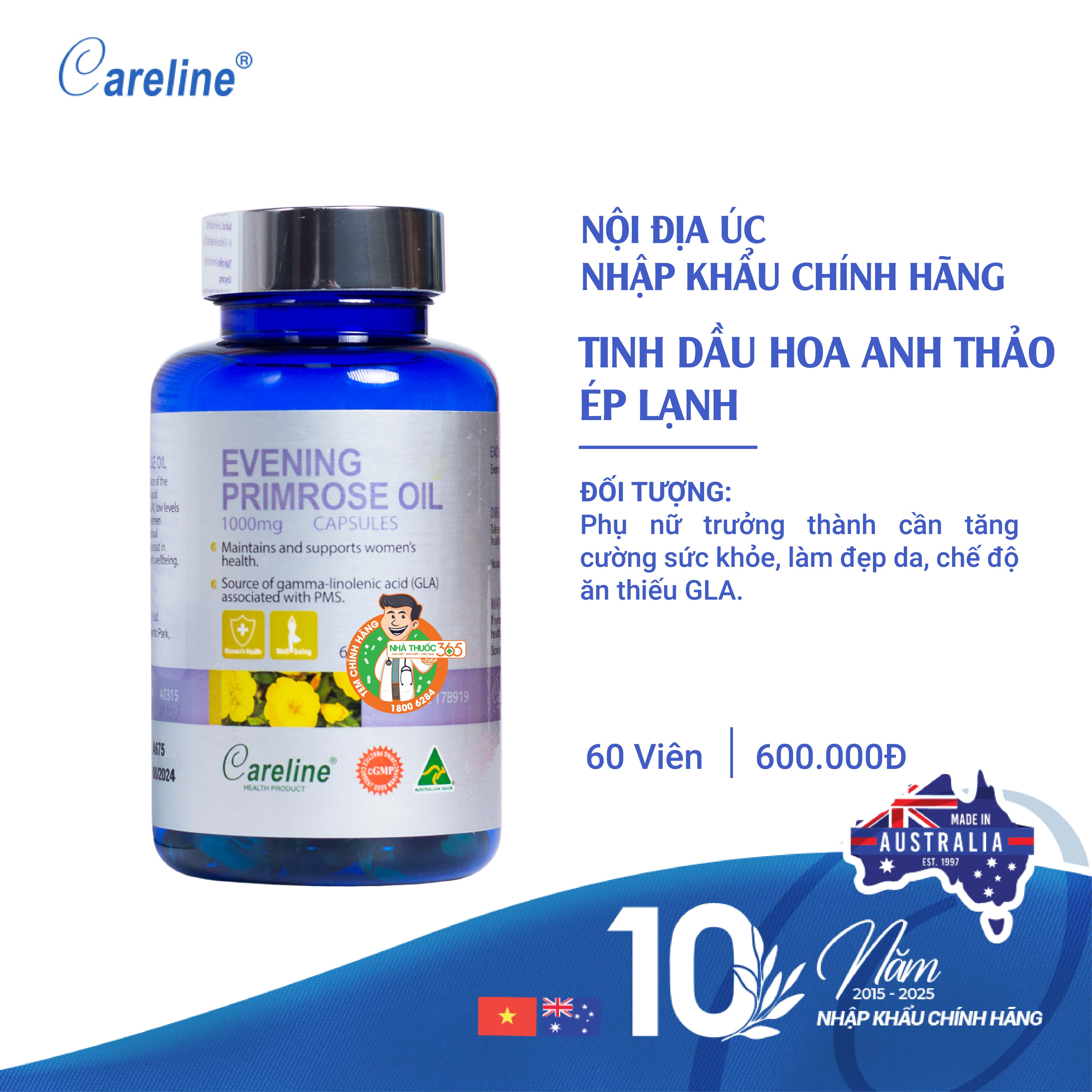 Tinh dầu hoa anh thảo Careline được sản xuất theo công thức ép lạnh giúp lưu giữ thành phần GLA (Gamma – Linolenic Acid) ở nồng độ cao hỗ trợ tăng cường nội tiết tố, tăng cường sức khỏe tổng thể và làm đẹp da.