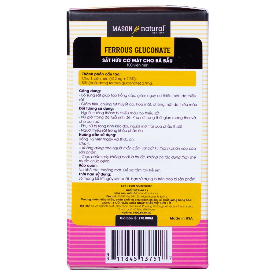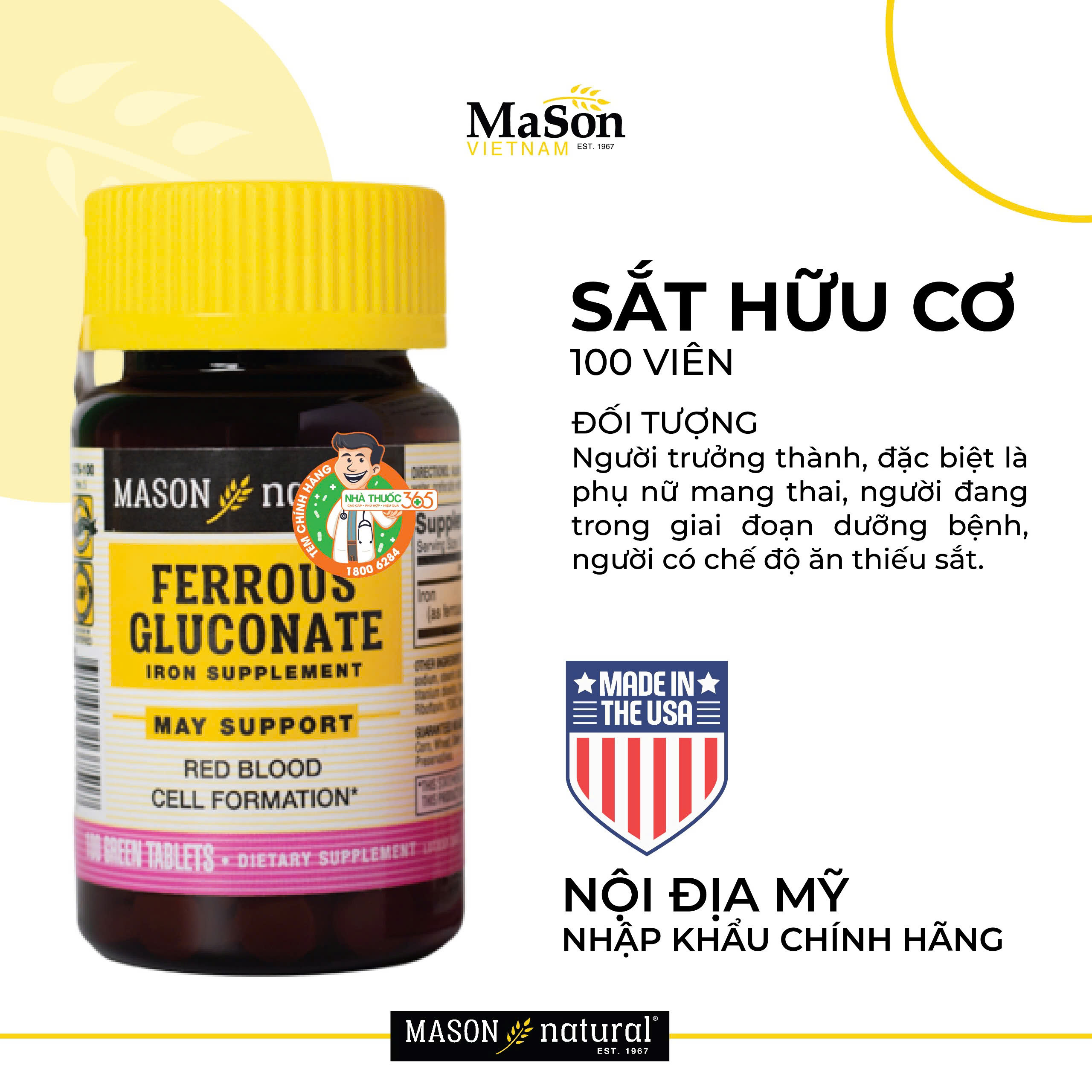 Mason Natural Ferrous Gluconate 100 viên – Sản phẩm bổ sung sắt hữu cơ