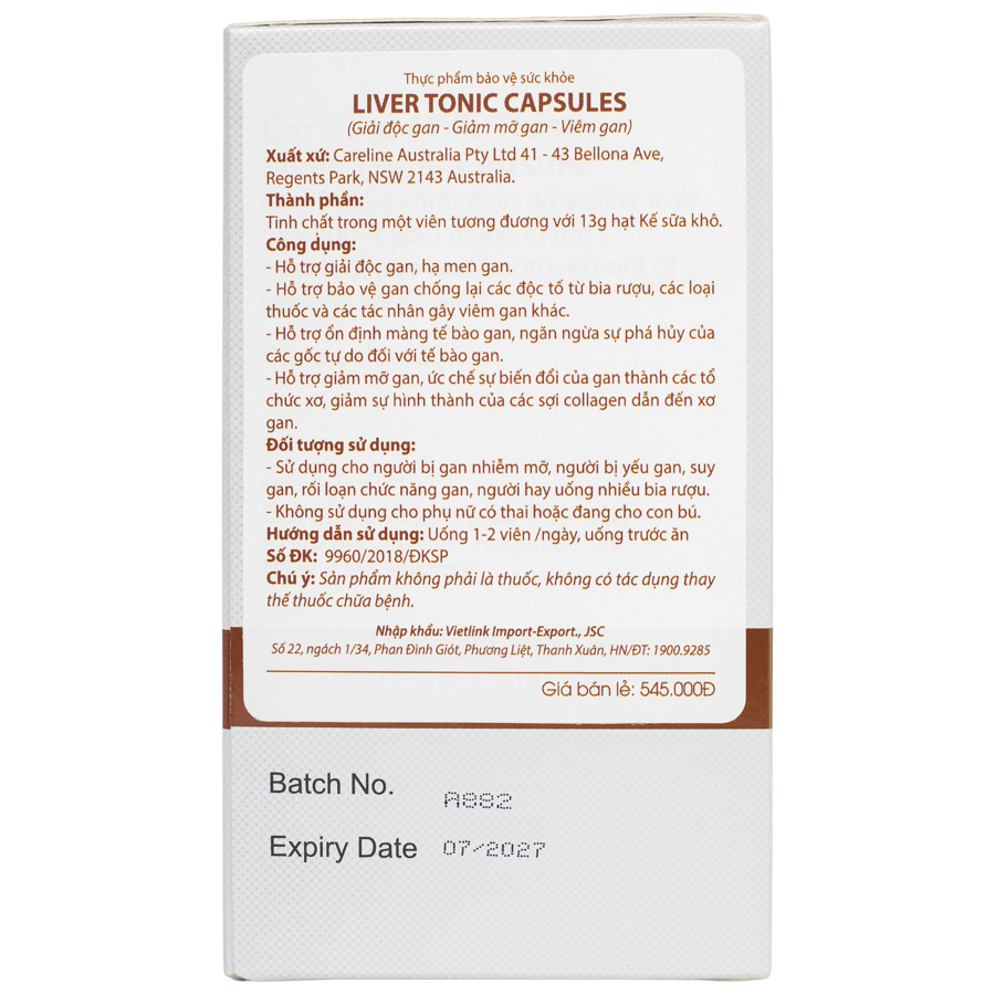 Liver Tonic Capsule là sản phẩm hỗ trợ bổ gan, duy trì và cải thiện chức năng gan từ thương hiệu Careline - Úc.