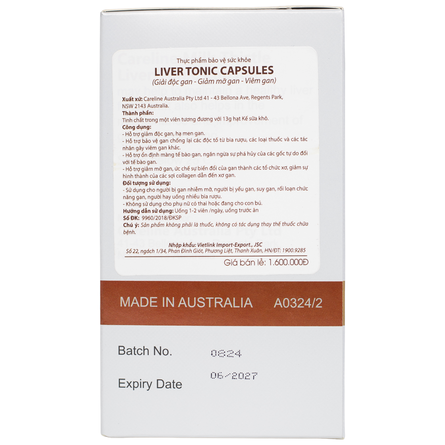 Liver Tonic Capsule là sản phẩm hỗ trợ bổ gan, duy trì và cải thiện chức năng gan từ thương hiệu Careline - Úc.