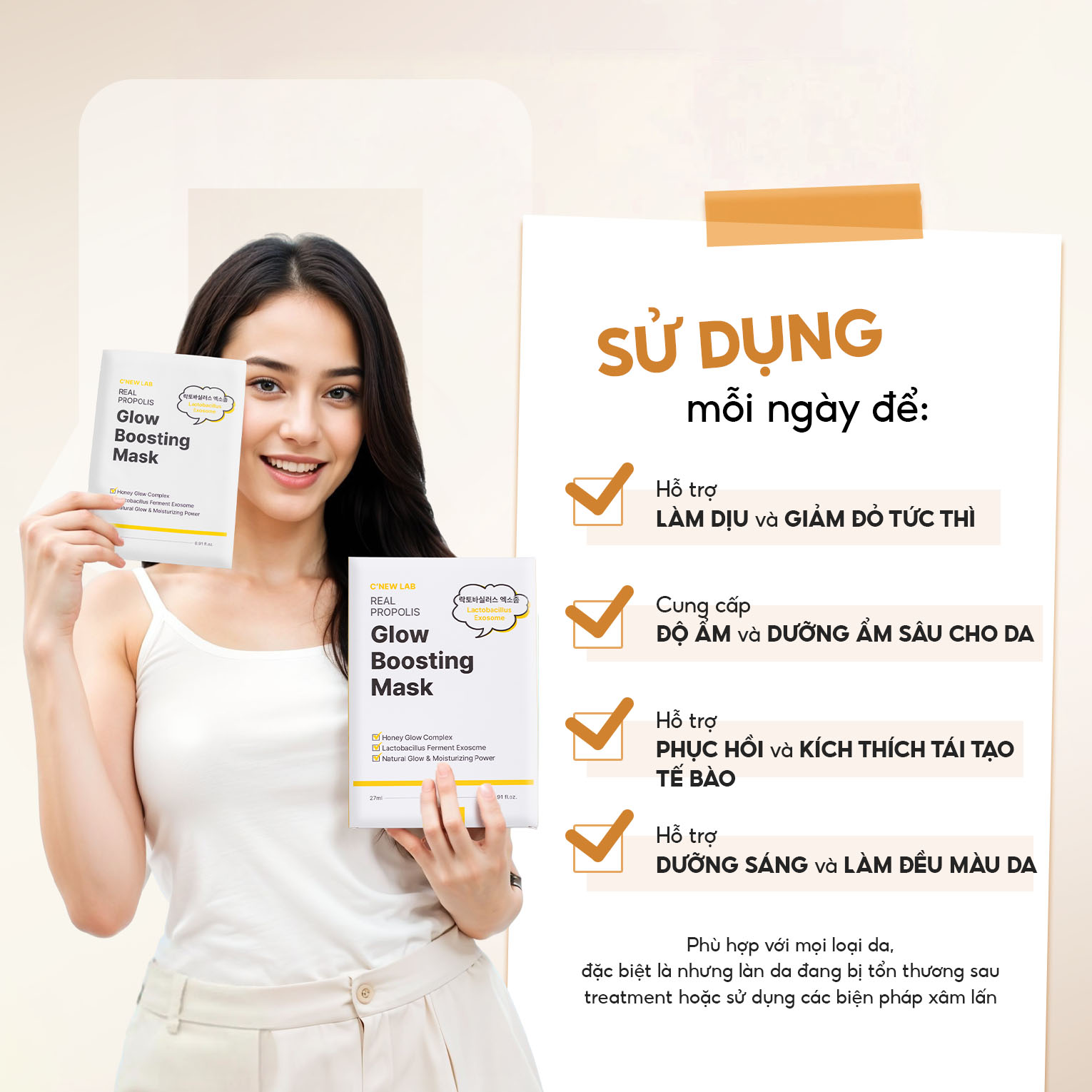 =>Phù hợp với nhiều loại da, lý tưởng cho những làn da đang bị tổn thương sau Treatment hoặc sử dụng các biện pháp xâm lấn (peel da, nặn mụn, lăn kim, phi kim)