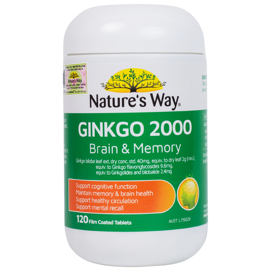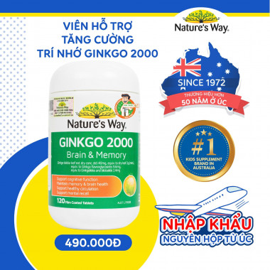 Nature's Way Ginkgo 2000 Brain & Memory là thực phẩm bảo vệ sức khỏe dạng viên nén bao phim, chứa chiết xuất lá bạch quả giúp hỗ trợ tăng cường trí nhớ và cải thiện chức năng nhận thức cho người trưởng thành.