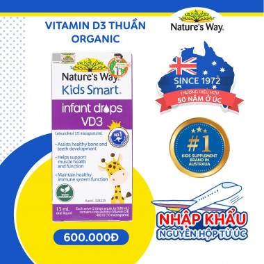 Nature's Way Kids Smart Infant Drops VD3 là thực phẩm bảo vệ sức khỏe dạng lỏng dành cho trẻ sơ sinh và trẻ nhỏ, giúp bổ sung vitamin D3 hỗ trợ hấp thu canxi, hỗ trợ phát triển hệ xương và răng chắc khỏe từ giai đoạn đầu đời.