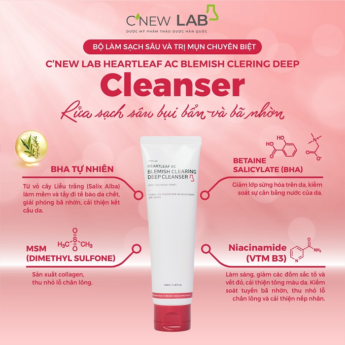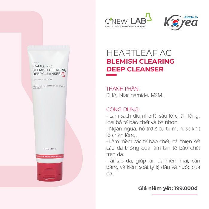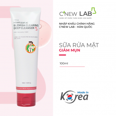 C'New Lab Heartleaf AC Blemish Clearing Deep Cleanser là sản phẩm sữa rửa mặt làm sạch và ngăn ngừa mụn cho da. Sản phẩm được chiết xuất từ nguyên liệu tự nhiên chứa BHA, niacinamide, dimethyl sulfone, panthenol, ... với tác dụng làm sạch sâu lỗ chân lông, làm dịu và cấp ẩm cho da hiệu quả.