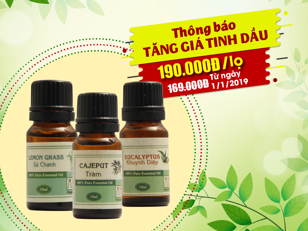 Trong gần 5 năm phân phối các sản phẩm tinh dầu An Organics Nhà thuốc 365 luôn cố gắng giữ mức giá ổn định cho là 169.000đ/ lọ 10ml. Tuy nhiên, với biến động của thị trường, sự tăng vọt của giá nguyên liệu cũng như các tác động khác nên hãng hãng An Organics buộc phải tăng giá một số loại tinh dầu như tinh dầu tràm, khuynh diệp, sả chanh.