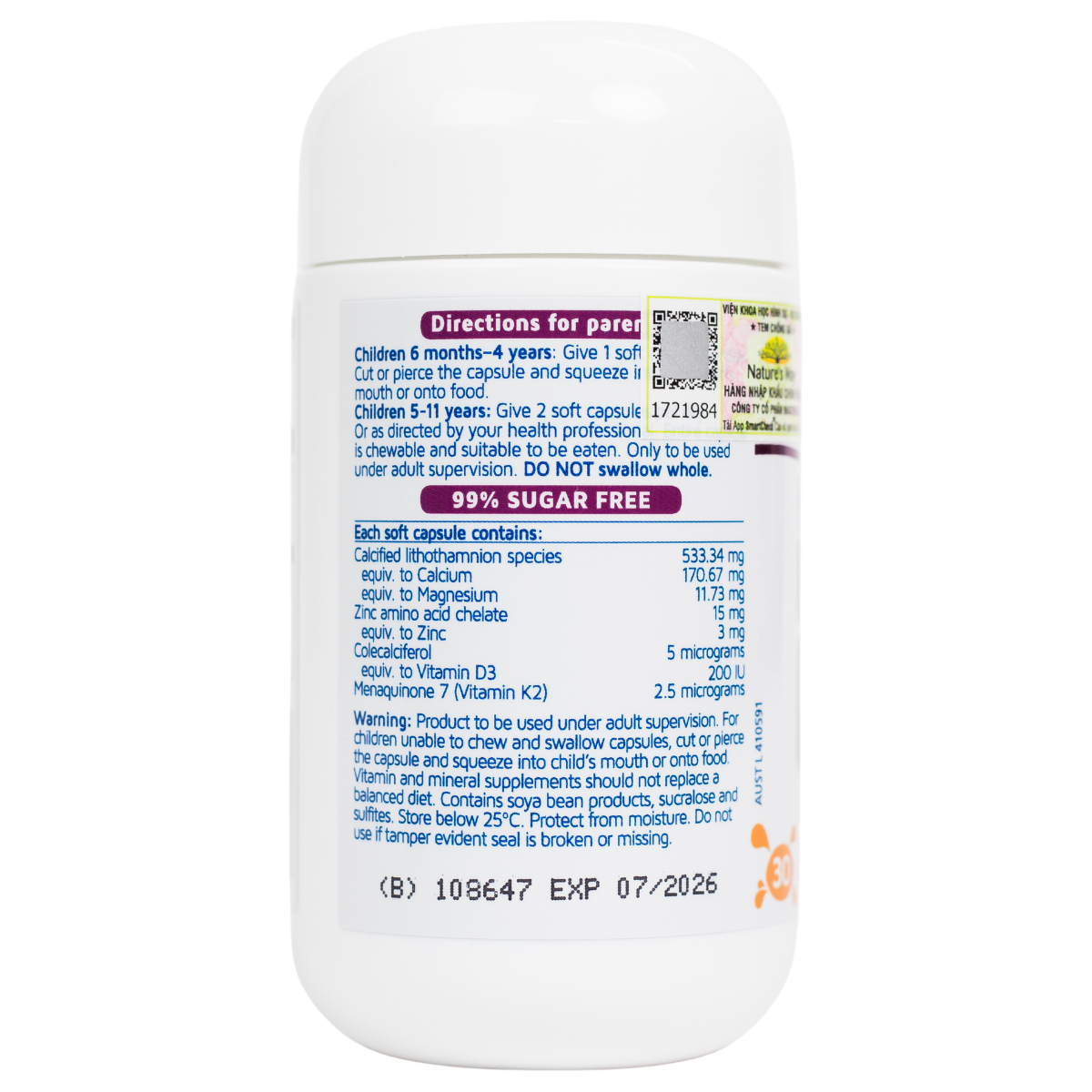 - Vitamin D3 (Colecalciferol): 200IU