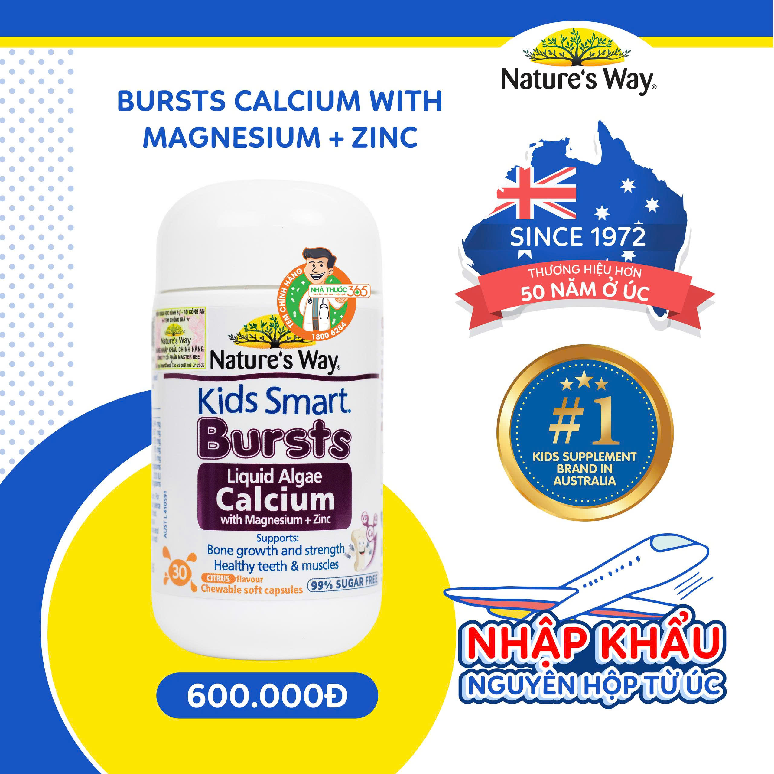 Nature's Way Burst Calcium With Magnesium + Zinc hỗ trợ bổ sung canxi, giúp cải thiện sự chắc khỏe của xương, răng, giúp giảm nguy cơ còi xương ở trẻ em.